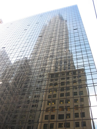 Building. Sollte leicht zu finden sein, ist immerhin 320 Meter hoch. Trotzdem sind wir zunächst vorbei gelaufen, bis die Sonne plötzlich rauskam und wir die Spiegelung im Hochhaus vor uns gesehen haben. Das ist das Chrysler Building und weil es schon millionenmal photografiert worden ist, habe ich es mal bei dieser schönen Perspektive belassen. Bemerkenswert ist noch, dass beim Bau um 1930 herum, kein einziger Arbeiter ums Leben kam. |