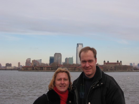 sie in die Vereinigten Staaten eingebürgert wurden. Die Bauten auf Ellis Island, die heute als Museum für die Einwanderungsbewegung dienen, sind hinter uns zu sehen. |