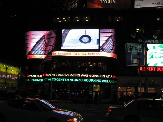 mittendrin. Obwohl sich der Trubel um den Time Square immer weiter ausdehnt und auch schon die Nebenstrassen einbezieht ist es genau hier. Hier ist die berühmteste Kreuzung der Welt, hier treffen sich Broadway und 7th Avenue, hier schlägt das Herz der Stadt, die niemals schläft. Die Helligkeit durch die hunderte Leuchtreklamen ist enorm, hier geht es rund um die Uhr ab!! |