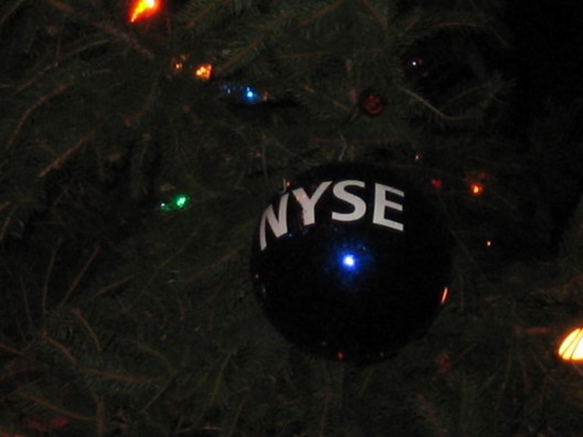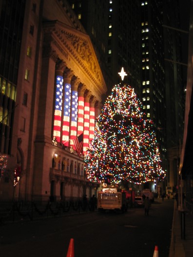 New Yorker Börse. Es war inzwischen dunkel geworden, hier war es trotzdem taghell, nicht nur wegen dem Weihnachtsbaum. Die US-Flagge an den Säulen wurde von zig-tausend farbigen Glühbirnen geformt, die die Nacht zum Tag machten. |